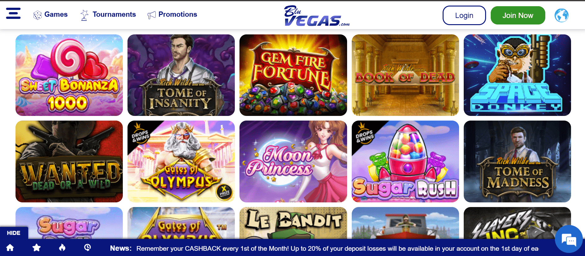 BluVegas bietet eine umfangreiche Spielebibliothek. Sie können verschiedene Video-, Jackpot- und Megaways-Slots sowie zahlreiche Tischspiele spielen, darunter verschiedene Varianten von Roulette, Blackjack, Poker, Baccarat und viele mehr.