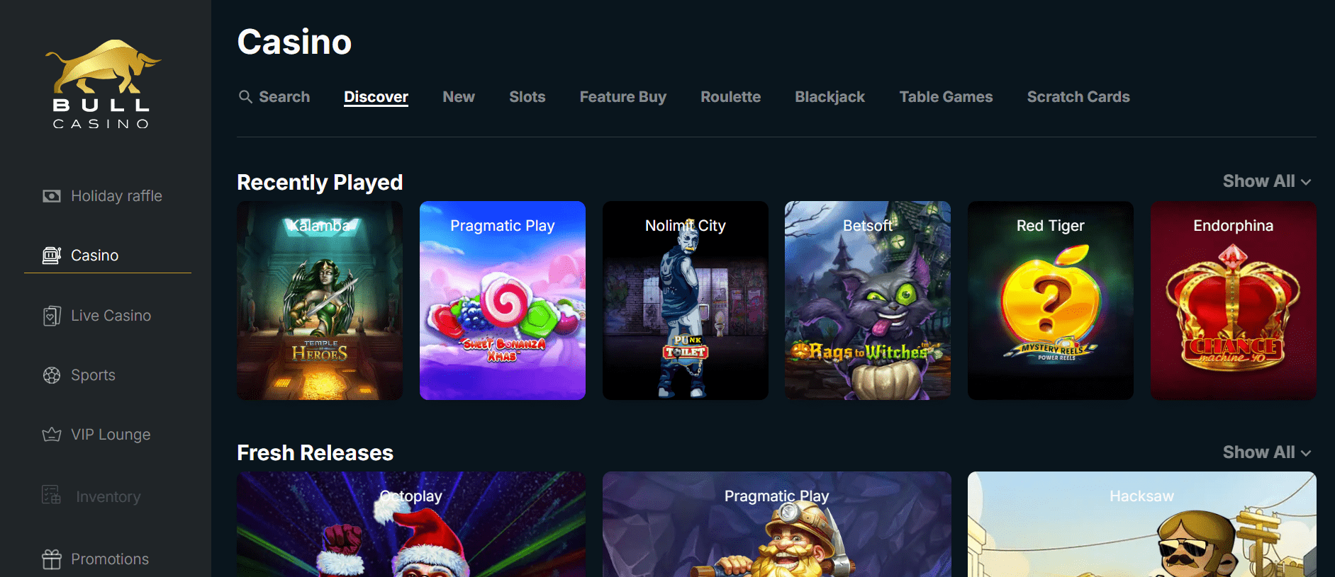 The leading game providers at Bull Casino include Play’n Go, Pragmatic Play, and Evolution